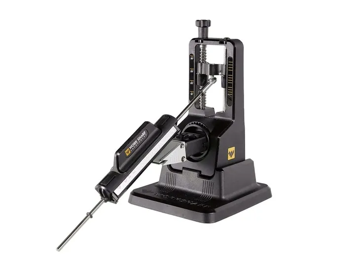 Ostrzałka do noży Work Sharp Precision Regulacja to system ostrzenia noży z regulacją kąta i trzema ziarnami ściernymi. Podstawa do ostrzenia zapewnia stabilną platformę do ostrzenia na stole, a innowacyjnie zaprojektowana tuleja zaciskowa ostrza pozwala szybko i bezpiecznie zabezpieczyć nóż. Trzon (Tri-Brasive Rod) ma z trzech stron płytkę diamentową o grubości 320 i drobnoziarnistej 600 (do szybkiego przywracania krawędzi noża) oraz drobnoziarnisty kamień ceramiczny (do ostrzenia krawędzi). Kąt ostrzenia można łatwo regulować w zakresie od 15° do 30° w krokach co 1°.